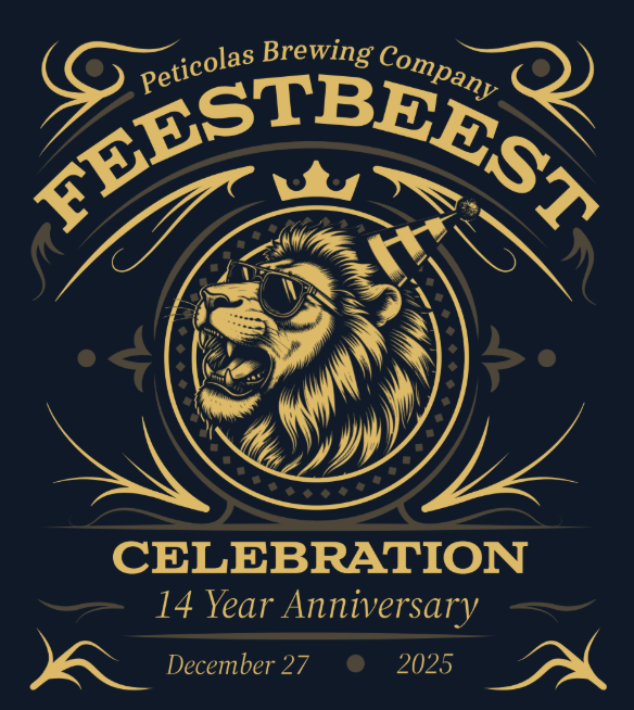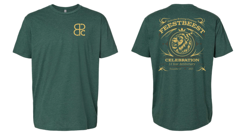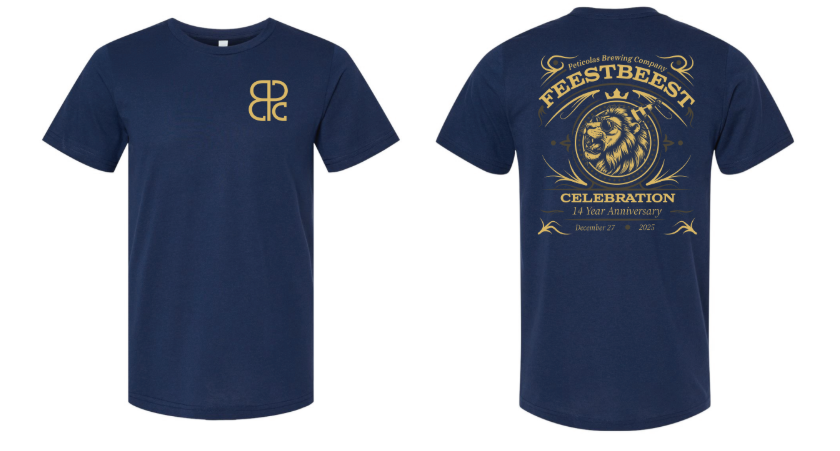 Gold PBC logo on front left breast, and large anniversary FeestBeest logo printed on back in gold. Choose between four different colors to be printed on. We'll have it ready for you when you check in to the party on 12/27!